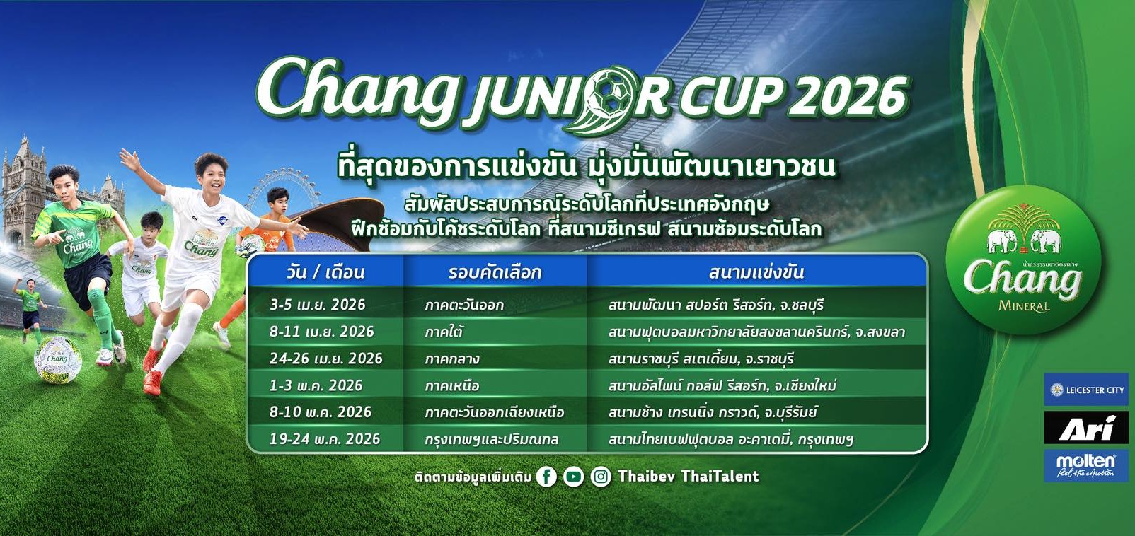 “น้ำแร่ธรรมชาติตราช้าง” ระเบิดศึกฟุตบอลเยาวชนรุ่นอายุ 13 ปี “Chang Junior Cup 2026” ที่สุดของรายการแข่งขัน มุ่งมั่นพัฒนาเยาวชน เฟ้นหาสุดยอดทีมพร้อม "Most Talented Player" หรือ "นักเตะผู้มีพรสวรรค์ยอดเยี่ยม" 1 รางวัล และ “Sportsmanship Awards” หรือ "นักเตะที่มีความสามารถและเป็นผู้มีน้ำใจนักกีฬายอดเยี่ยม" 2 รางวัล เดินทางไปสัมผัสประสบการณ์ระดับโลกที่ประเทศอังกฤษ ฝึกซ้อมกับโค้ชระดับโลก ที่สนามซีเกรฟ สนามซ้อมระดับโลก