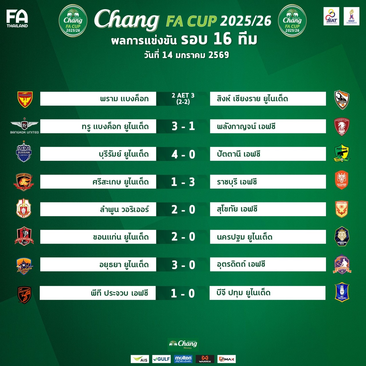 สรุปผลฟุตนอลช้าง เอฟเอคัพ รอบ 16 ทีมสุดท้าย