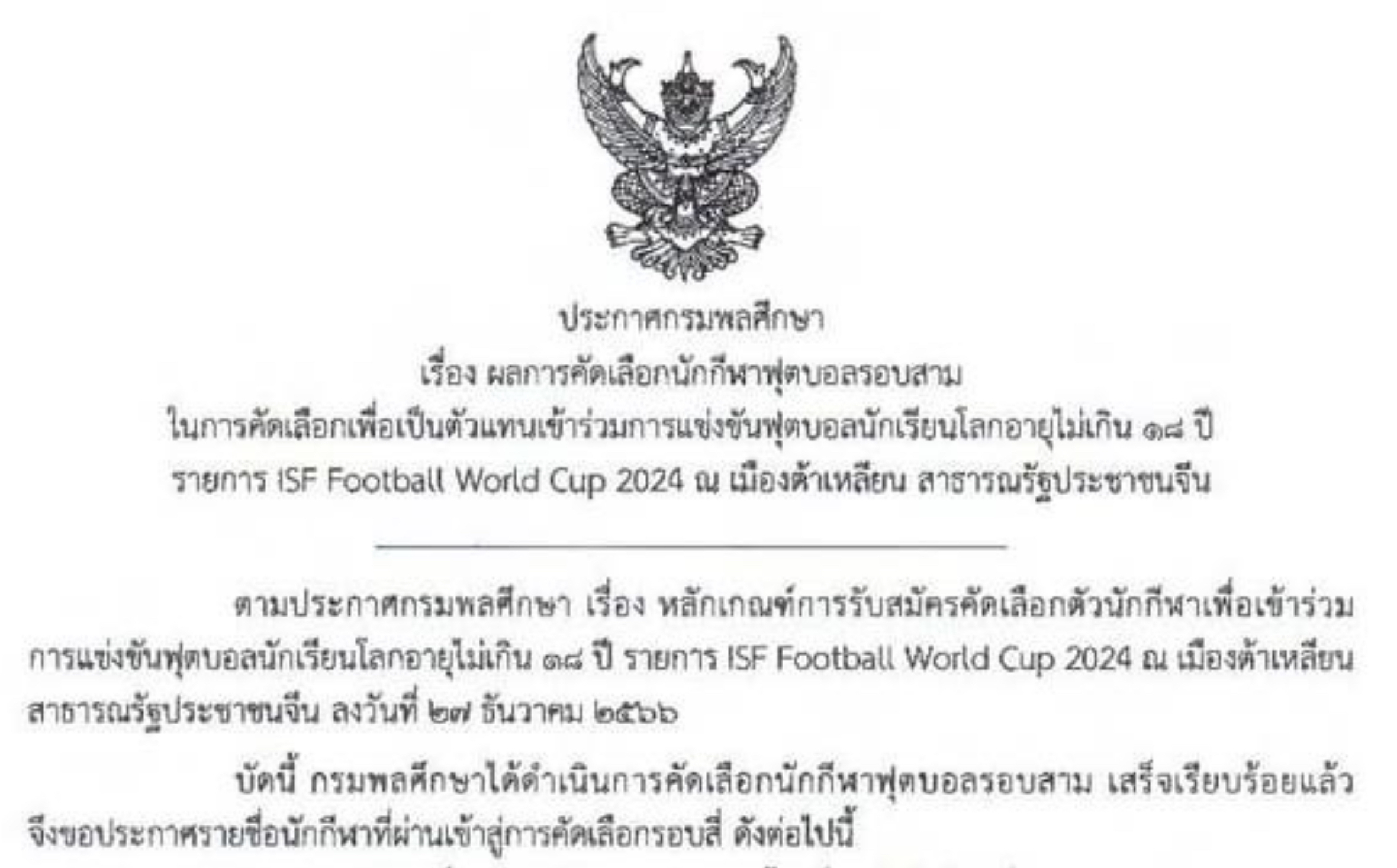 กรมพลศึกษา ประกาศรายชื่อผู้ผ่านการคัดเลือกนักฟุตบอลที่จะเข้าร่วมการแข่งขันฟุตบอลรายการ นักเรียนโลกอายุไม่เกิน 18 ปี รายการ ISF Football World Cup 2024