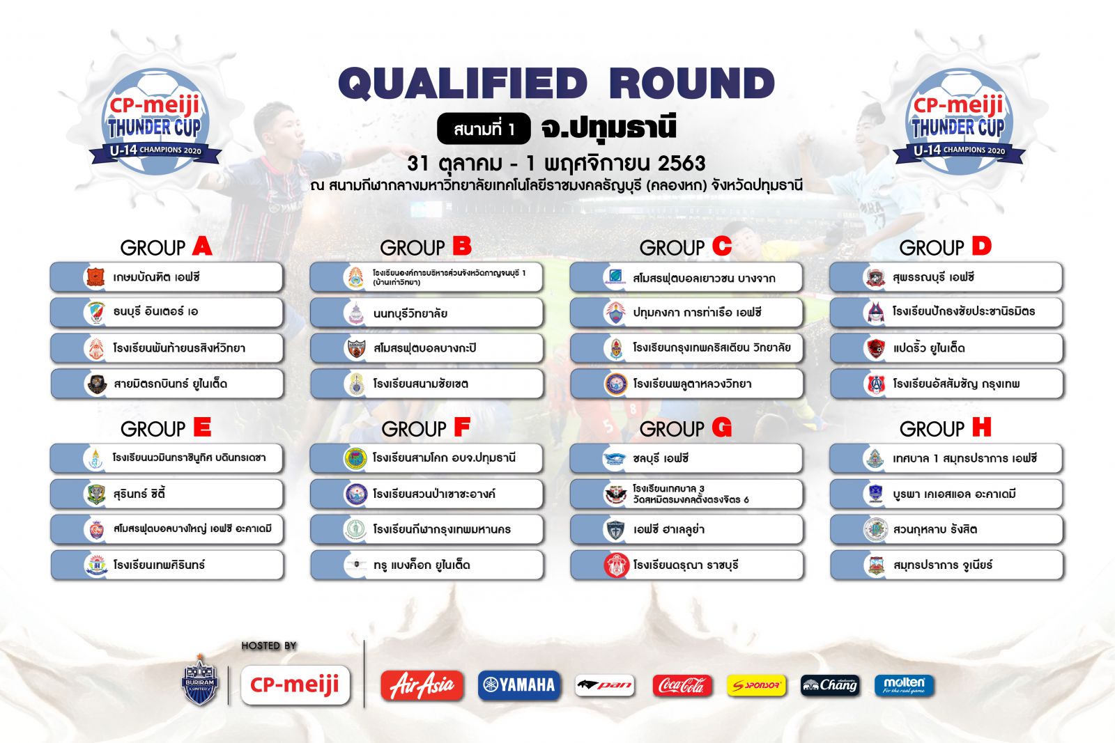 สำหรับการแข่งขันฟุตบอลเยาวชน “CP-Meiji Thunder CUP U-14 Champions 2020” รอบคัดเลือกทั้ง 3 สนาม มีดังนี้ สนามที่ 1 จะมีขึ้นที่ สนามกีฬากลางมหาวิทยาลัยเทคโนโลยีราชมงคลธัญบุรี (คลองหก) จังหวัดปทุมธานี วันที่ 31 ตุลาคม - 1 พฤศจิกายน 2563, สนามที่ 2 จังหวัดปัตตานี ใช้สนามกีฬากลางองค์การบริหารส่วนจังหวัดปัตตานี (สนามเรนโบว์สเตเดียม) และสนามกีฬาองค์การบริหารส่วนตำบลบานา วันที่ 14-15 พฤศจิกายน 2563 และสนามที่ 3 ใช้สนามกีฬาองค์การบริหารส่วนจังหวัดแพร่ และสนามกีฬาเทศบาลตำบลทุ่งโฮ้ง เป็นสังเวียนแข้ง ระหว่างวันที่ 28-29 พฤศจิกายน 2563