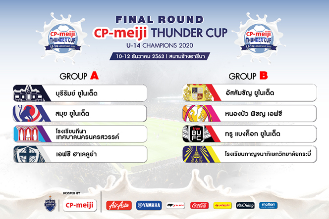 ความเคลื่อนไหวการแข่งขันฟุตบอลเยาวชน “CP-Meiji Thunder CUP U-14 Champions 2020” ซึ่งก่อนหน้านี้ ได้ 8 ทีม สู่การแข่งขันรอบสุดท้าย เรียบร้อยแล้ว ประกอบด้วย 1. บุรีรัมย์ ยูไนเต็ด (เจ้าภาพ), 2. อัสสัมชัญ ยูไนเต็ด (รองแชมป์เก่า), 3. ทรู แบงค็อก ยูไนเต็ด (แชมป์รอบคัดเลือก สนามที่ 1), 4. เอฟซี ฮาเลลูย่า (รองแชมป์รอบคัดเลือก สนามที่ 1), 5. รร.กาญจนาภิเษกวิทยาลัย กระบี่ (แชมป์รอบคัดเลือก สนามที่ 2), 6. สมุย ยูไนเต็ด (รองแชมป์รอบคัดเลือกสนามที่ 2), 7. รร.กีฬาเทศบาลนครนครสวรรค์ (แชมป์รอบคัดเลือก สนามที่ 3) และ8. หนองบัว พิชญ เอฟซี (รองแชมป์รอบคัดเลือก สนามที่ 3)