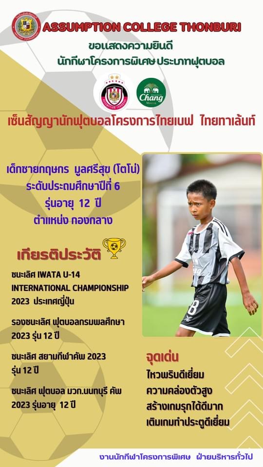 โรงเรียนอัสสัมชัญธนบุรี ขอแสดงความยินดีกับนักกีฬาโครงการพิเศษ ประเภทฟุตบอล ชั้นประถมศึกษาปีที่ 6 ที่ได้เซ็นสัญญานักฟุตบอลโครงการไทยเบฟ ไทยทาเล้นท์ จำนวน 6 คน ได้แก่