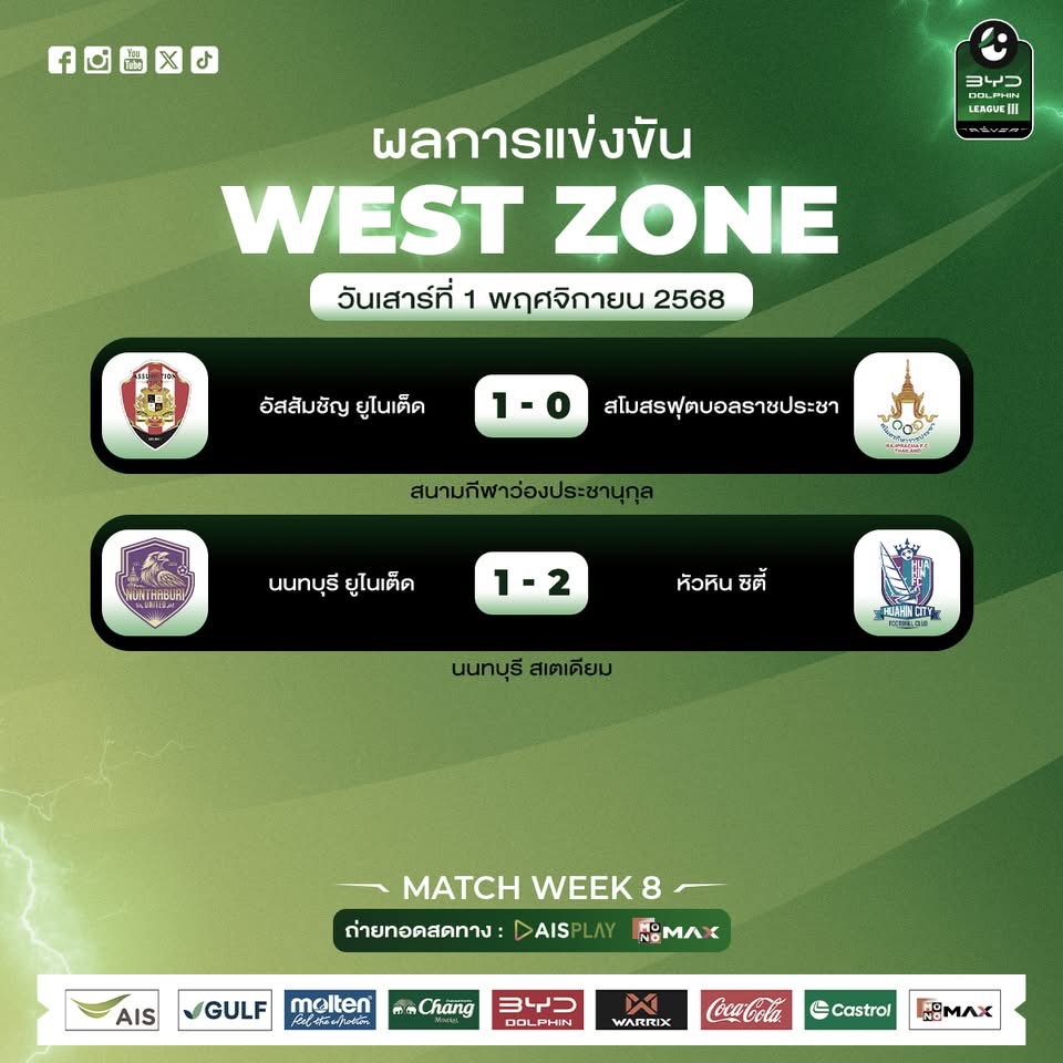 การแข่งขัน แมตช์วีคที่ 8 ของศึก BYD DOLPHIN LEAGUE 3 SEASON 2025/26