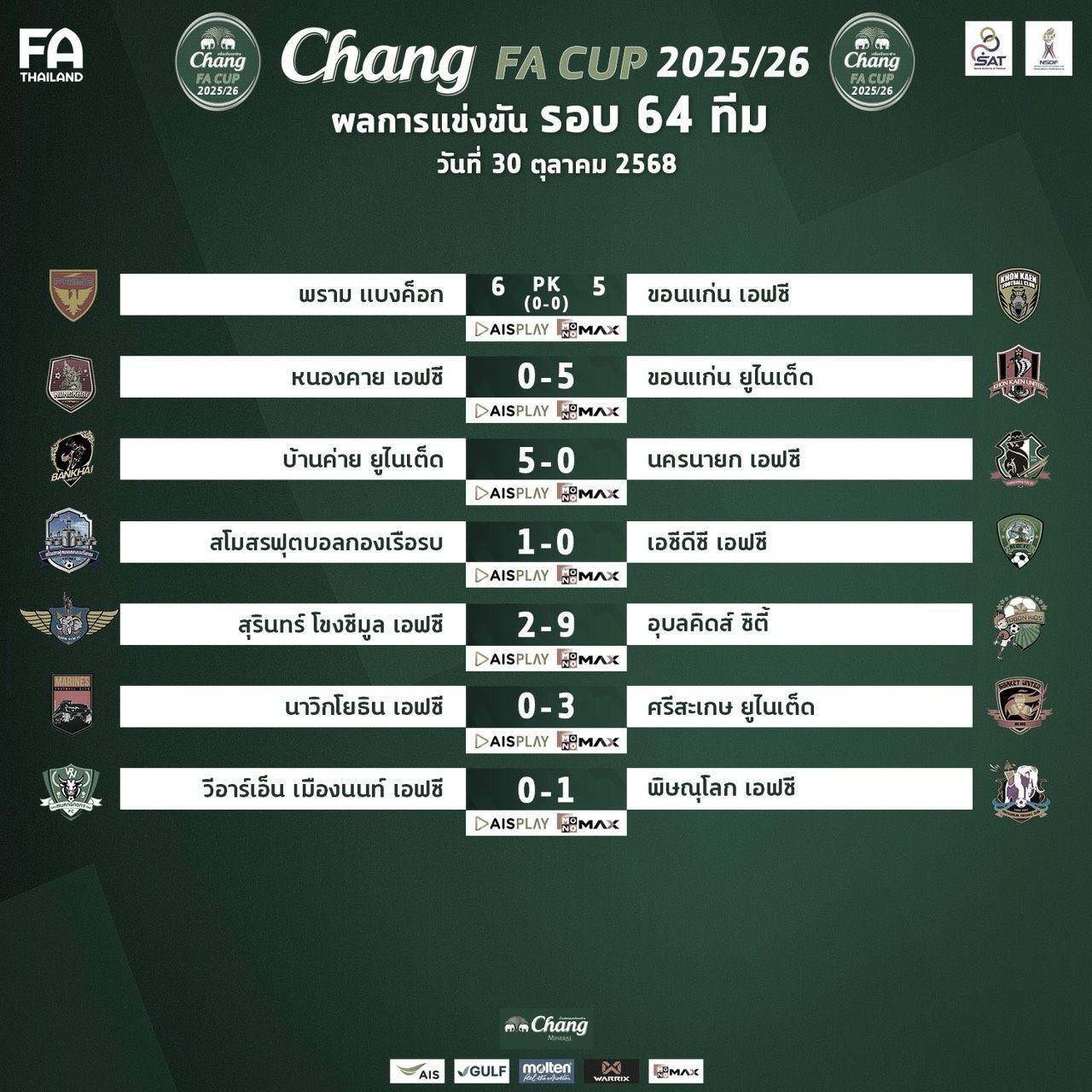 สรุปผลฟุตบอล "ช้าง เอฟเอ คัพ" ฤดูกาล 2025/26 รอบ 64 ทีมสุดท้าย